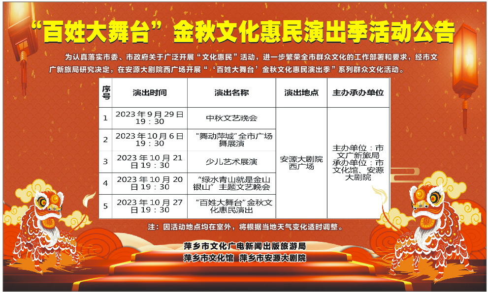 【演出预告】 萍乡市“百姓大舞台”金秋惠民演出季活动公告